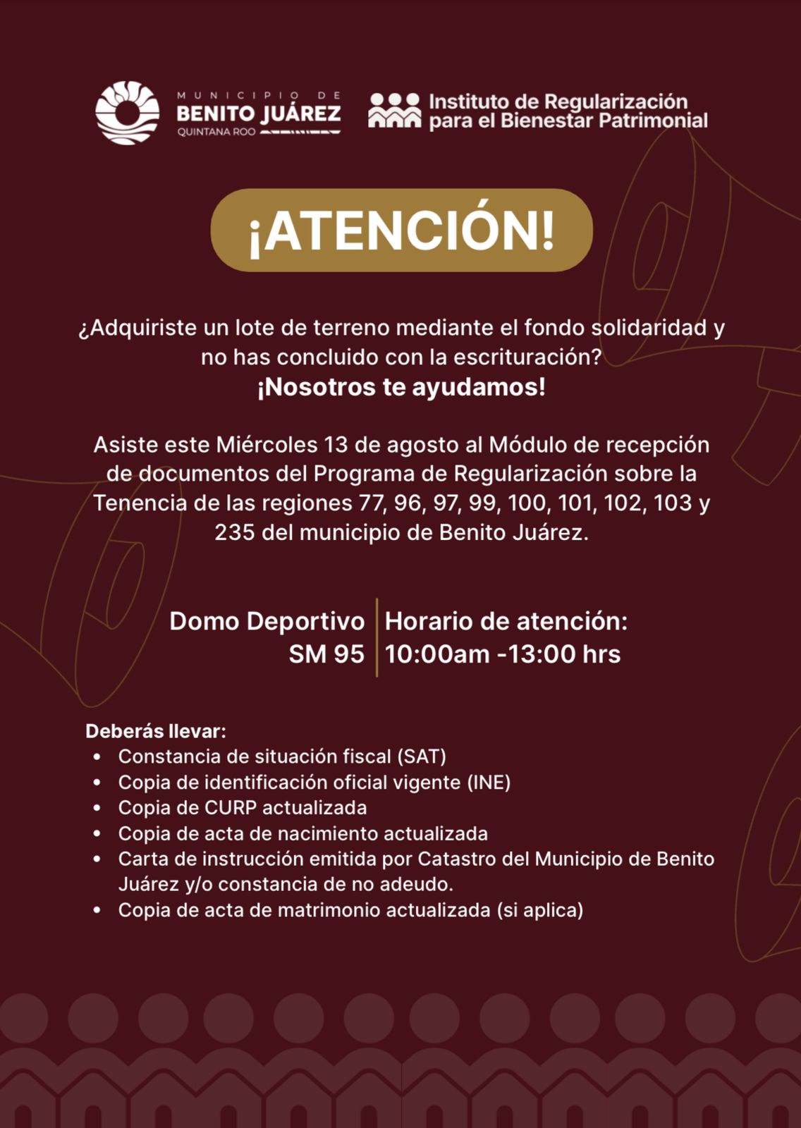 El miércoles 13 del presente, en el domo de la región 95, el Instituto de Regularización para el Bienestar Patrimonial instalará un módulo de recepción de documentos del Programa de Regularización sobre la Tenencia de las regiones 77, 96, 97, 99, 100, 101, 102, 103 y 235 del municipio de Benito Juárez.