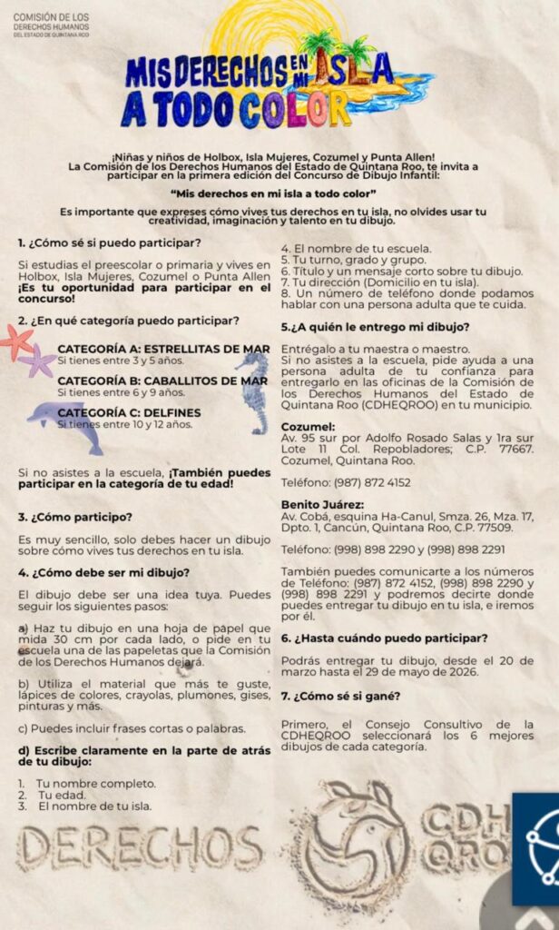 La convocatoria está dirigida a los menores entre 3 y 12 años que habitan Holbox, Isla Mujeres, Cozumel o Punta Allen, la convocatoria vence el próximo 29 de mayo u los ganadores se harán acreedores a premios como bicicletas y patinetas entre otros, informó Omega Ponce presidenta de la Comisión de Derechos Humanos en Quintana Roo