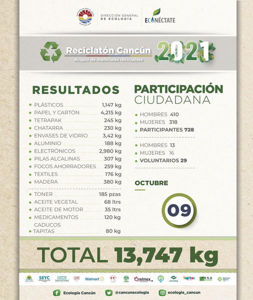 Un total de 13 mil 747 kilogramos de materiales reciclados se recolectaron en la décimo novena jornada del reciclatón, un ocho por ciento menos que en la pasada jornada donde se recolectaron 14 mil 940 kilogramos dio a conocer el secretario de ecología y desarrollo urbano, Armando Lara De Nigris.