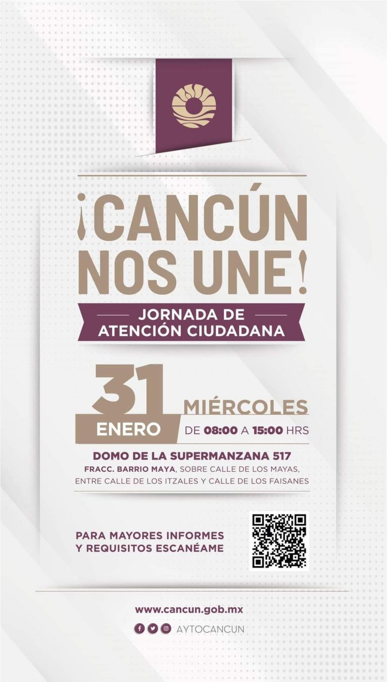 Este miércoles 31 de enero se realizará la Jornada de Atención Ciudadana «Cancún nos Une» en la región 517 o fraccionamiento Barrio Maya a partir de las 8 de la mañana hasta las 3 de la tarde.