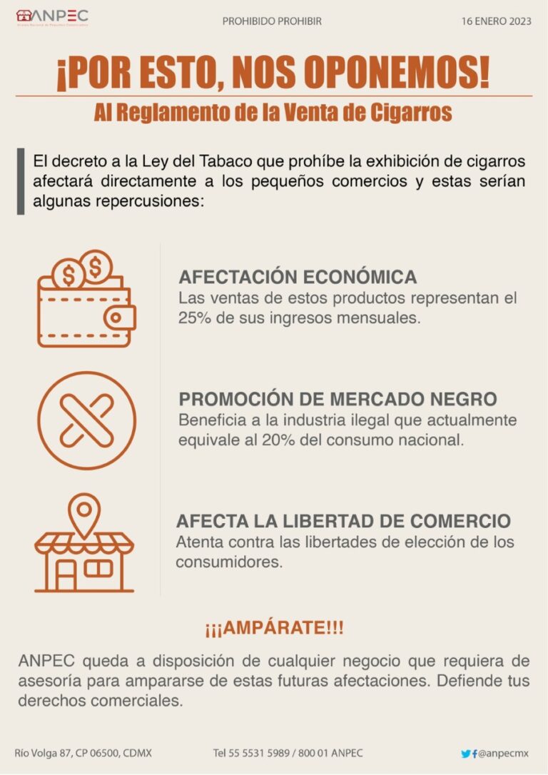 Tras la entrada en vigor de las modificaciones al reglamento de la Ley de Control del Tabaco, el pasado 15 de enero, la Alianza Nacional de Pequeños Comerciantes, anunció la puesta en marcha de una campaña de amparos en contra de dichas modificaciones que aseguran afecta al comercio legal, así lo señaló Cuauhtémoc Rivera, quien apuntó que en promedio un amparo tiene un costo de entre 40 a 50 mil pesos, es por ello que la alianza estará dando asesoría a los comercios que decidan seguir esta vía legal ya que el pequeño comercio no tiene ni el espacio ni los recursos para acatar las nuevas disposiciones que pide el nuevo reglamento.