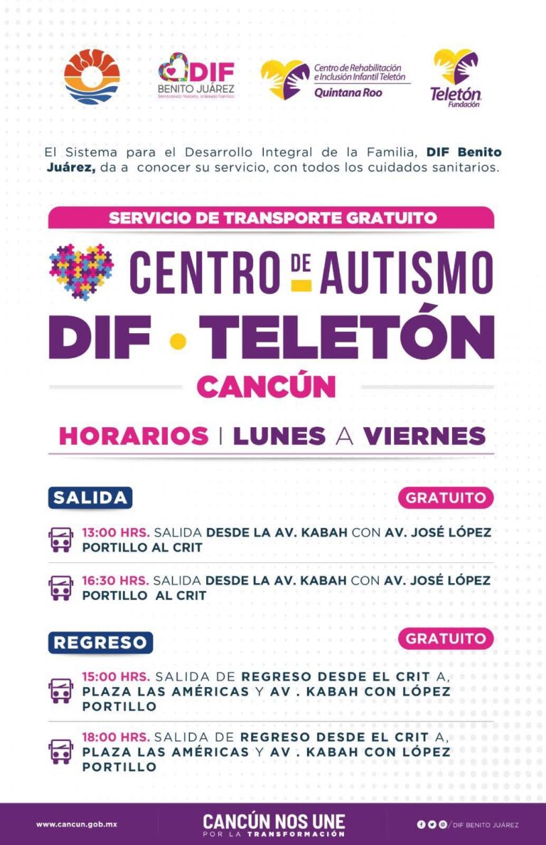 El servicio es para los menores que asisten en el turno vespertino en la clínica de autismo: salida, de la avenida Kabah con López Portillo a las 13:00 y 16:30 horas; y el regreso del CRIT a Plaza las Américas y a la avenida Kabah con Portillo es 15:00 y 18:00 horas, con ello los padres de familia podrán reducir un poco los gastos en transporte.