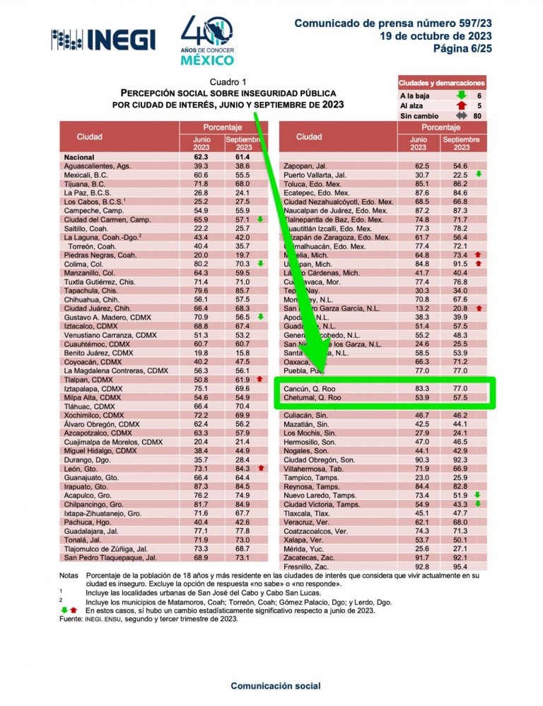 La presidente municipal, Ana Patricia Peralta, indicó que disminuyó un 6% el índice de percepción social sobre inseguridad pública de junio a septiembre en Cancún, de acuerdo al INEGI, al pasar de 83 a un 77%.