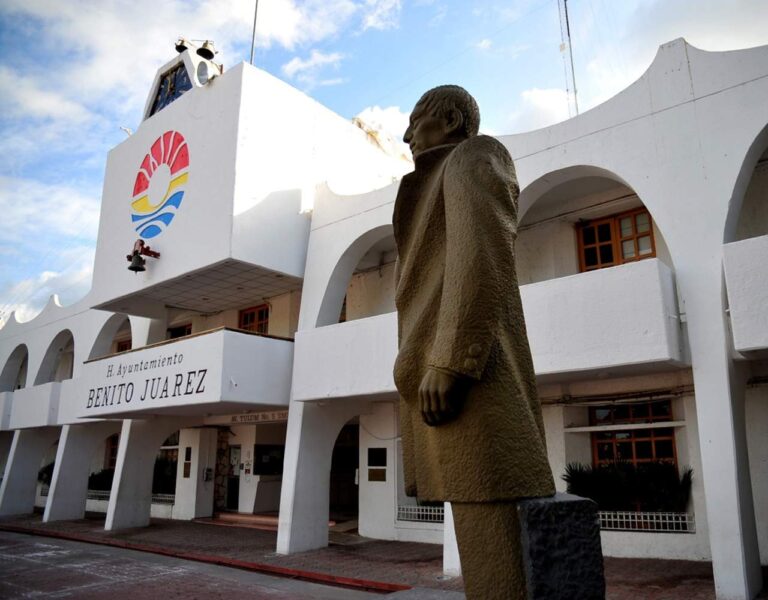 Hablemos hoy del Monumento a don Benito Juárez que engalana la entrada del Palacio Municipal de Cancún. Esta obra salió de las manos del escultor Víctor Manuel Gutiérrez Guerra. La obra está realizada en cantera labrada, tiene una altura de tres metros y fue colocada en su sitio actual en la Plaza de la Reforma en 1976.