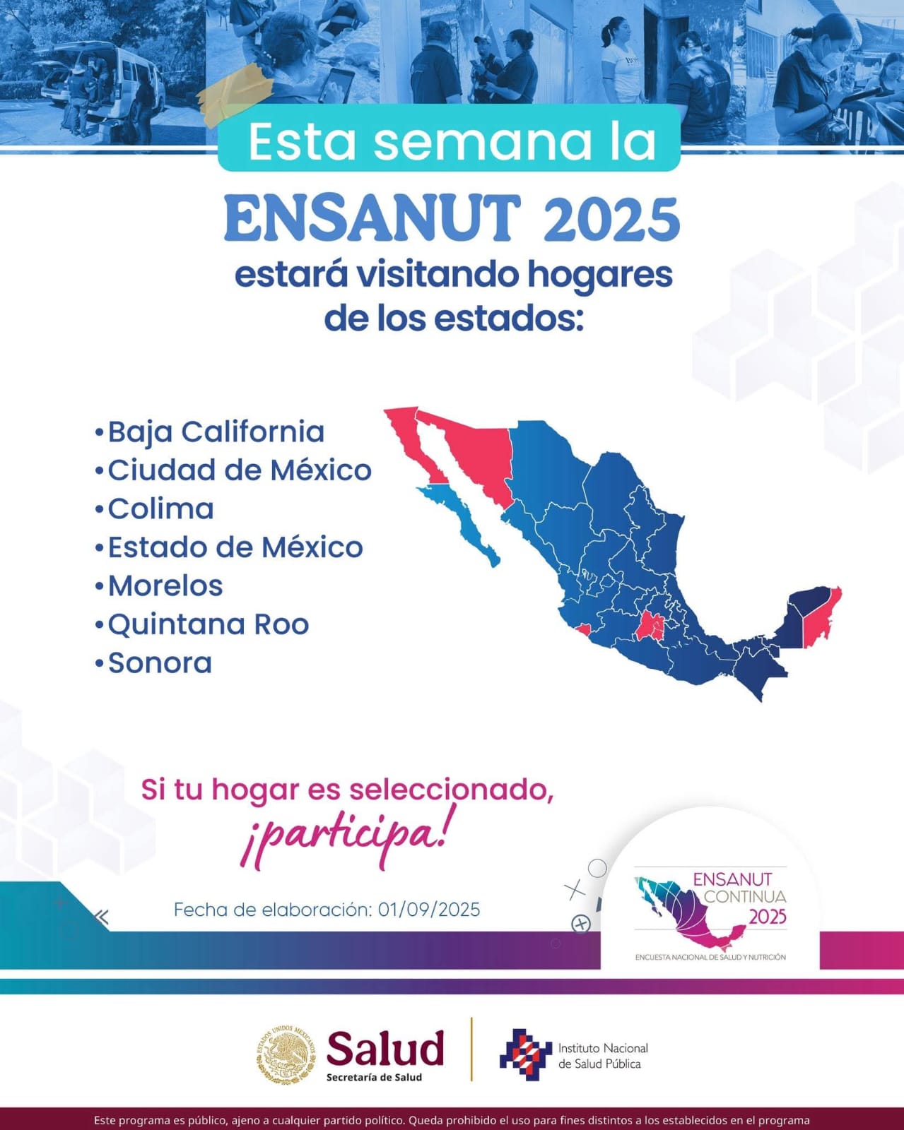 La Encuesta Nacional de Salud y Nutrición 2025 ya esta en marcha, en esta semana comenzó el levantamiento de encuestas en siete estados: Baja California, Ciudad de México, Colima, Estado de México, Morelos, Quintana Roo y Sonora.