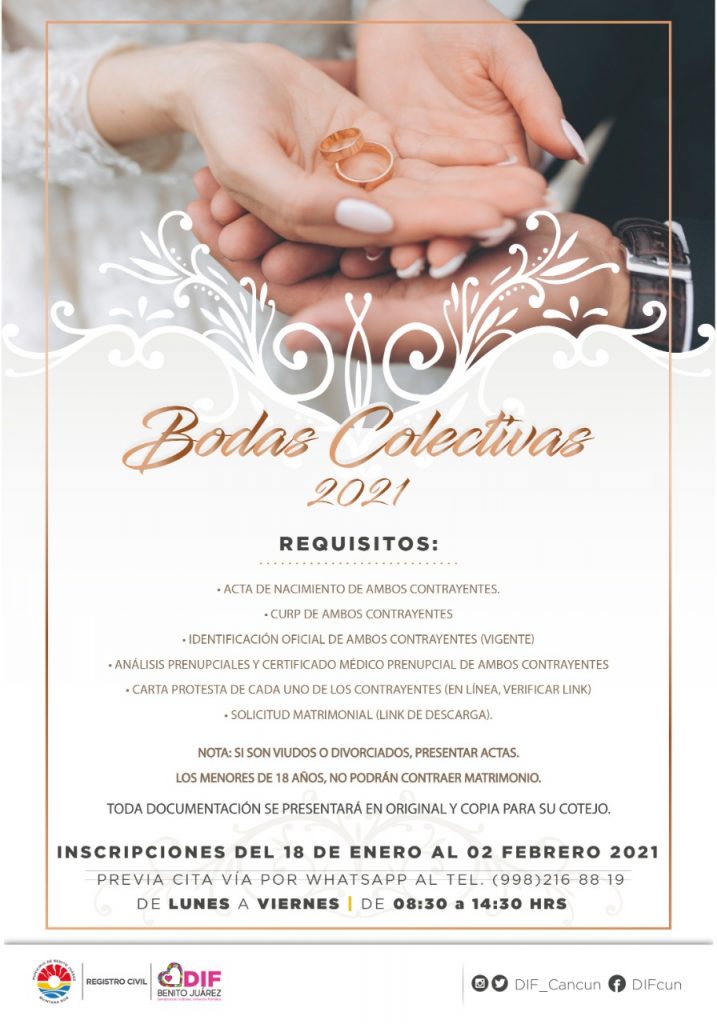 Cancún.- Con el objetivo de brindar certeza jurídica a las parejas benitojuarenses a fin de fortalecer la integración familiar, el gobierno municipal, a través del Sistema para el Desarrollo Integral de la Familia (DIF) Benito Juárez, anunció que llevará acabo una edición más de su tradicional programa de bodas colectivas.